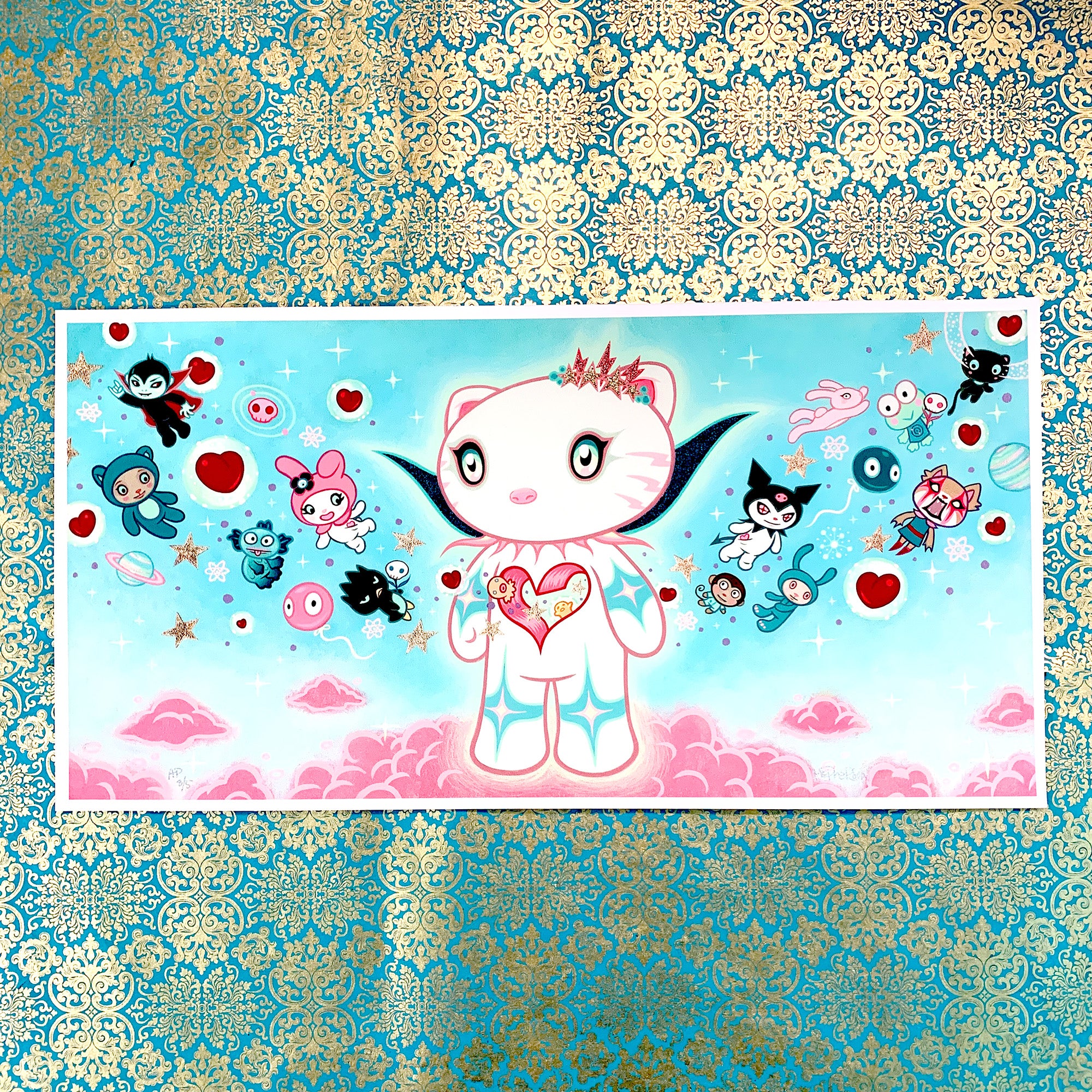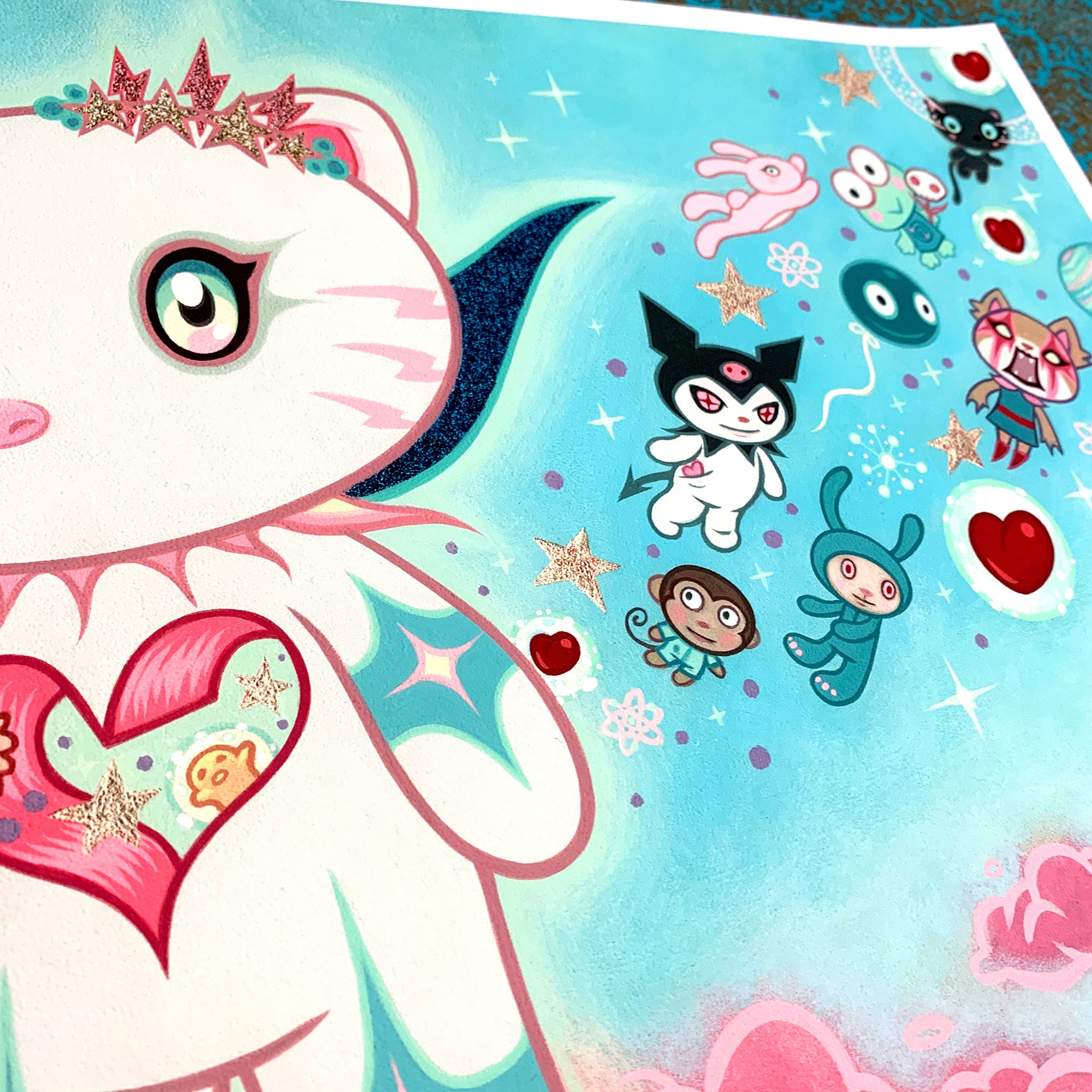 These Artist Proofs of Supernova Hello Kitty are printed from Tara McPherson’s fully realized original acrylic painting. Hello Kitty radiates at the center as a Supernova, releasing her Sanrio friends in a joyful cosmic burst.