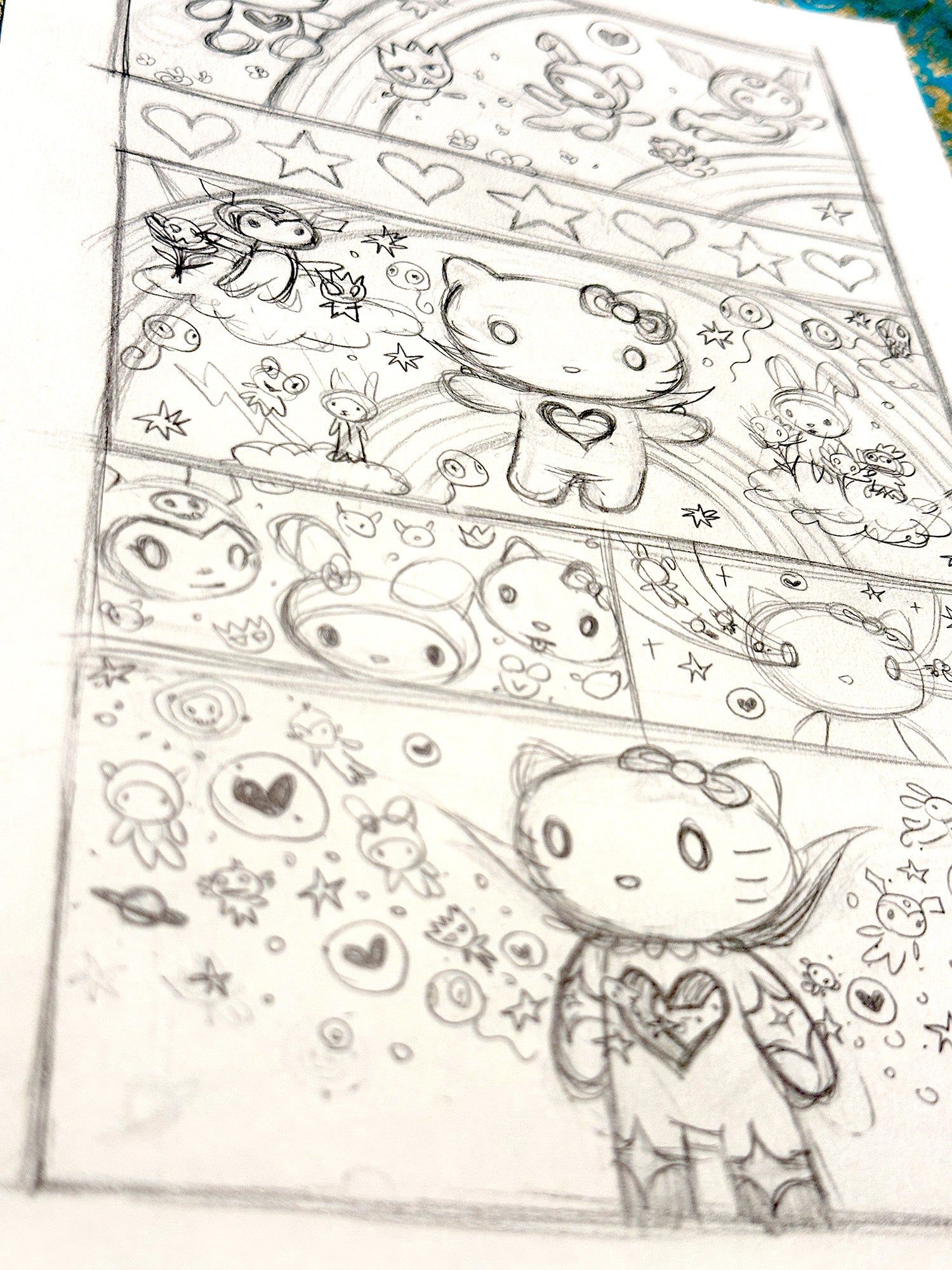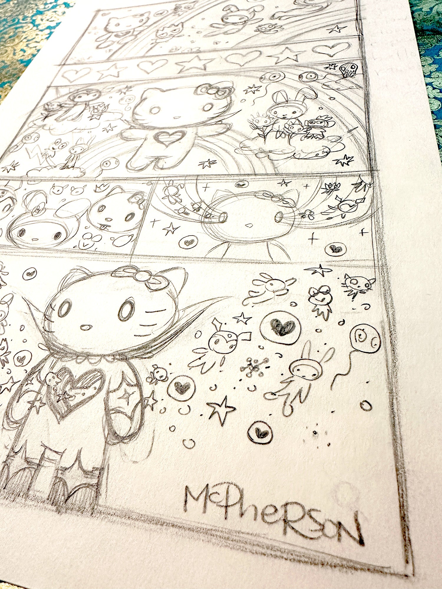This initial rough sketch captures the earliest look of Tara McPherson’s Supernova Hello Kitty collaboration, laid out with a playful comic strip sensibility. As the idea takes shape, Hello Kitty appears at the center with Tara's signature heart shaped hole bursting into a Supernova that releases a joyful cascade of her Sanrio friends in every direction. Intermixed among them are Tara’s own beloved characters, seamlessly blending the two worlds. Loose, energetic, with narrative charm, this sketch offers a glimpse into McPherson’s creative process where friendship, fun, and cosmic magic collide on paper.