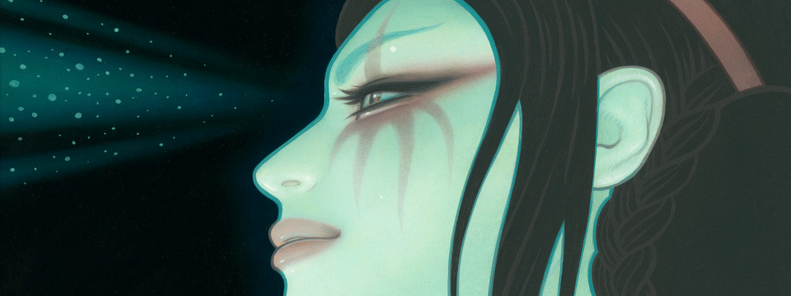 Secrets of the Polar Aurora is an oil painting that takes inspiration from the beautiful aurora borealis. Turning the theme into modern day mythology, we see a fictional representation of how auroras are created. 2nd edition.